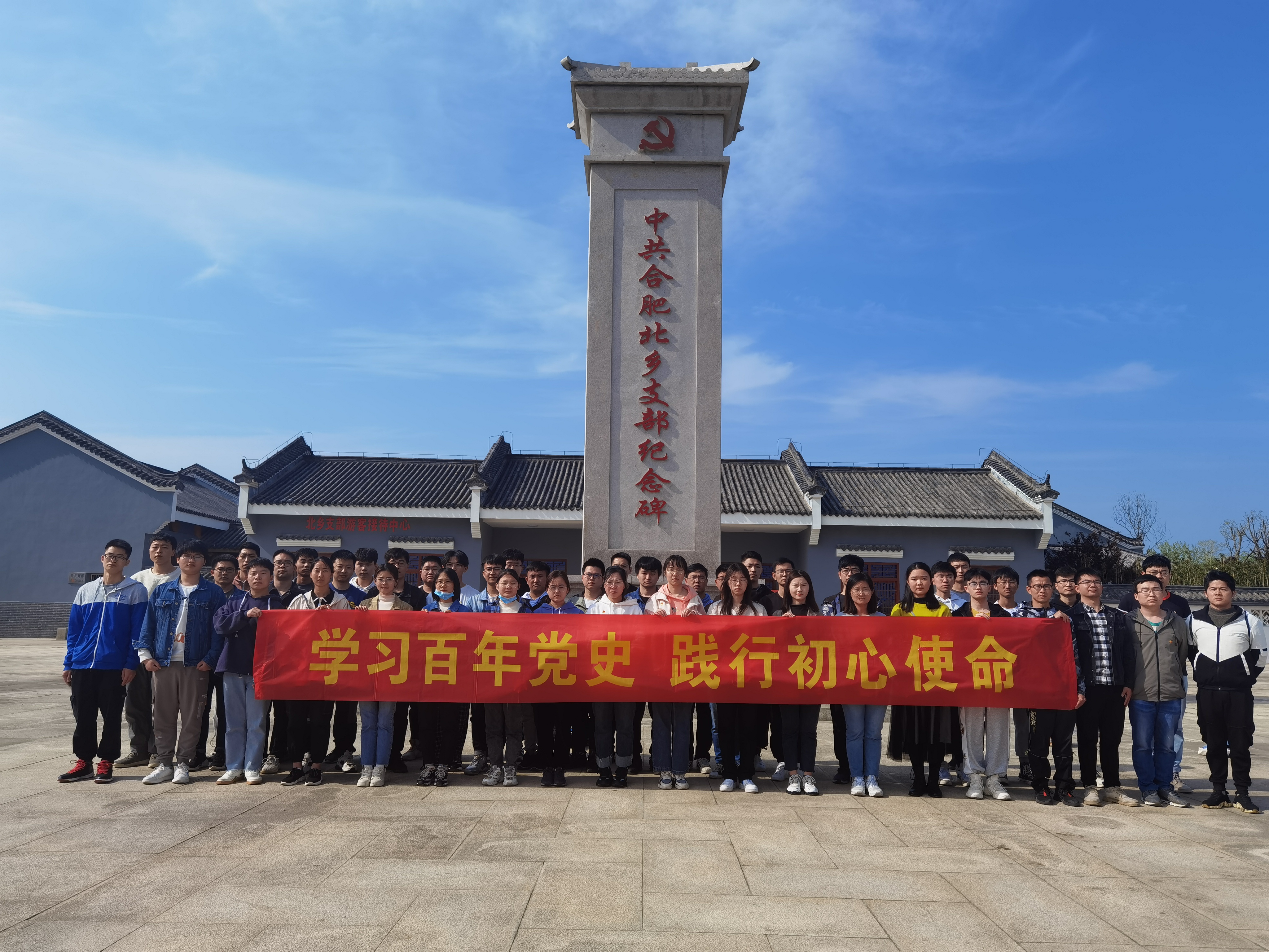 同学们首先来到纪念广场,拾阶而上,映入眼帘的是竖立在广场中央的一座庄严纪念碑,怀着崇敬的心情,在纪念馆负责人耿言林的介绍下,瞻仰纪念碑,重温党史,认真了解中共合肥北乡支部的创建历史背景及支部革命的光辉历程。在革命烈士纪念碑前全体党员进行集体了宣誓,重温入党誓词。