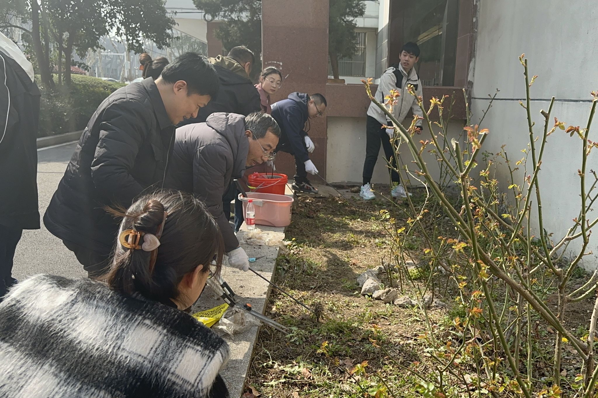 上午,在材料楼前的植树现场,材料学院机关党支部和本科生第二党支部师生热情饱满,齐心合力,干劲十足。师生一起挥锹铲土、栽种花苗、培土浇水,每道工序都一丝不苟,现场有条不紊的劳动场景成为材料楼前一道美丽的风景线。一番井然有序的忙碌后,一棵棵新栽种的月季花苗亭亭玉立。