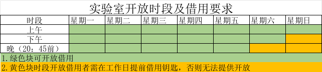4. 使用实验室时,请提前到科技园A座301领取钥匙,使用结束后,请检查实验室门窗并保持实验室整洁。若借用时间为周末,请在周五工作时间内提前借用钥匙。