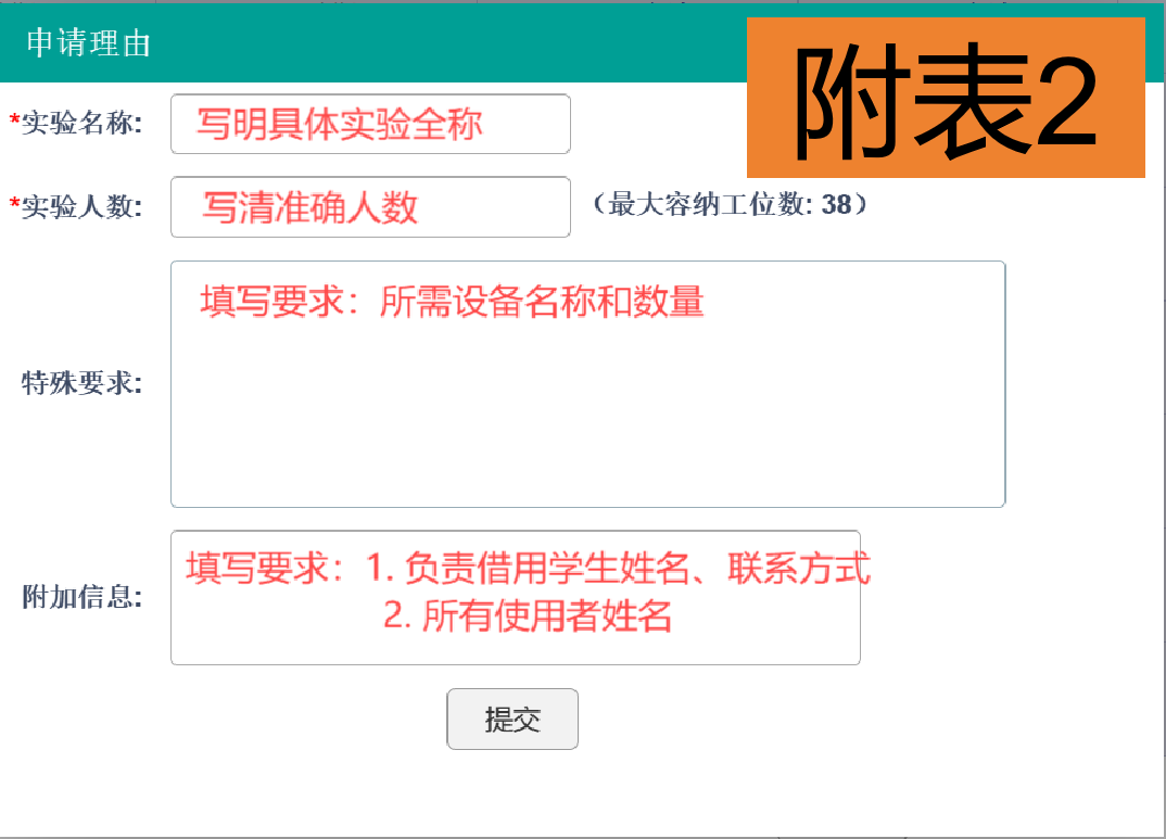 2. 请准确写明预约开放【实验名称】(如:XX实验/XX训练),并在【特殊要求】栏中填写所需设备名称和数量,在【附加信息】中填写借用者姓名、联系方式(具体填表要求见附表2)。