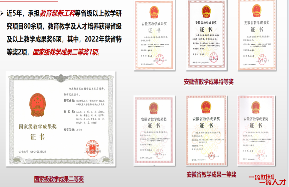 专业依托学院资深教授和校外专家组成的教授团队进行精英人才培养。拥有教育部专业教学指导委员会委员3人,教育部长江学者特聘教授1名,国家优秀青年基金获得者1名,国家“万人计划”创新领军人才1名,教育部跨世纪和新世纪优秀人才2人,享受国务院政府津贴专家5人,安徽省杰出青年基金获得者3人等专家教授团队。专业秉持“服务国家重大战略工程以及战略性新兴产业”为宗旨,近五年来先后承担国家重点研发计划项目、国家重点基础研究发展规划项目、装备预研教育部联合基金、军委装发部“十三五”装备预研共用技术、国家自然科学基金优秀青年基金项目、国家自然科学基金项目、安徽省揭榜挂帅项目等,在Nature Communications,Advanced Materials, Advanced Energy Materials, Advanced Functional Materials, Chemical Communications等高水平学术期刊发表论文多篇,授权国家发明专利多项,先后获得包括国家级教学成果二等奖、安徽省科技进步一等奖、安徽省教学成果特等奖在内的奖励多项。
